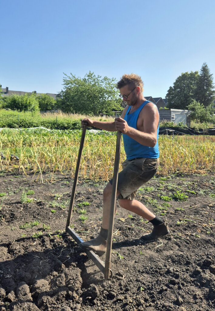 Depuis 2022, Pierre Bertiaux, l’initiateur de ce projet, cultive sur 0,7 hectare (exclusivement des « fonds de jardin » mis à disposition par les propriétaires) plus de 70 variétés différentes de légumes, en respectant le cahier des charges de l’agriculture biologique, et avec l’ambition de nourrir environ 200 personnes. L’idée est surtout que le projet productif soit approprié et « porté » par une petite communauté, appelée à s’agrandir afin de développer un modèle viable et durable dans le temps. Les légumes en vrac, tout droit sortis des potagers, sont mis à disposition dans les étalages présents sur place. Le système de vente en circuit court est organisé par abonnement annuel selon les principes de la « Communauté en Soutien à l’Agriculteur » ou CSA. Cette formule permet de soutenir directement les maraîchers. En engageant les mangeurs sur la durée, elle garantit un revenu stable au producteur et renforce la viabilité de l’activité. Le coût par an et par adulte s’élève à 520 € (soit 10 € par semaine pendant 52 semaines ; prix dégressif pour les jeunes de moins de 18 ans). Les membres abonnés viennent aux champs durant les heures d’ouverture, ils se servent à volonté en légumes autoproduits au rythme des saisons et en s’engageant à se limiter aux quantités qu’ils consommeront en frais. Sur l’étalage, des produits d’achat-revente sont également mis à disposition afin de compléter l’offre.
